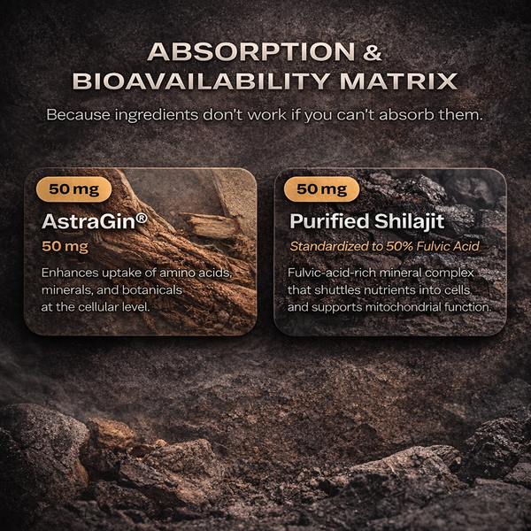 Our Vitali-T formula goes a step further with a dedicated absorption matrix. We combine pure Shilajit with AstraGin® to ensure your body absorbs every ingredient fully.